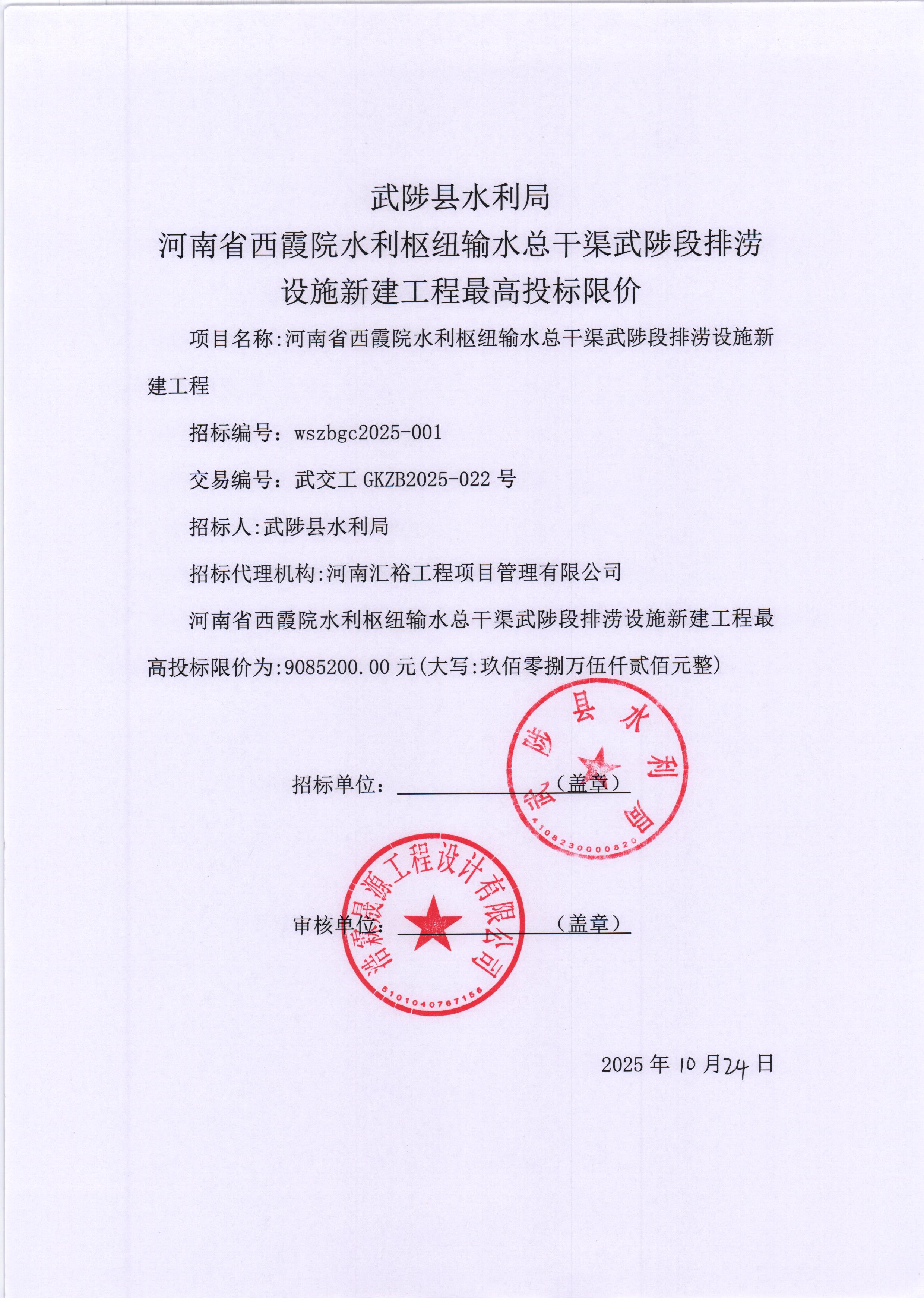 河南省西霞院水利枢纽输水总干渠武陟段排涝设施新建工程招标控制价最高投标限价:******.00(大写:玖佰零捌万伍仟贰佰元)