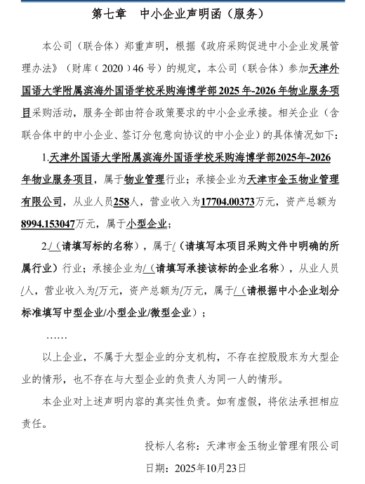 ************学校采购海博学部2025年-2026年物业服务项目实施采购,现将中标结果公布如下: 一、项目名称和编号 ******学校采购海博学部2025年-2026年物业服务项目 2.项目编号:TJBH-2025-D-0162 二、中标信息 ******有限公司 2.中标供应商地址:天津市滨海新区福州道55号水利科技大厦五楼 3.供应商评审报价、评审总得分及排序情况:见附件 4.主要中标标的名称、规格型号、数量、单价、服务要求或者标的基本概况:物业服务 ******委员会成员名单 边宇、周丽娅、陈曦、徐明涛、郭掌印(采购人代表) 四、项目联系人及联系方式 1.联系人:郭晓萌 2.联系方式:022-****** 五、采购人的名称、地址和联系方式 1.采购人名******学校 2.采购人地址:天津市滨海新区中新天津生态城和韵路1799号 3.采购人联系电话:郭掌印,022-****** 六、采购代理机构的名称、地址和联系方式 1.采购代理机构名称:天津市滨海新区政府采购中心 2.采购代理机构地址:天津市滨海新区营口道468号 3.采购代理机构联系方式:022-****** 七、质疑方式 参与本项目政府采购活动的供应商认为中标结果使自己的合法权益受到损害的,可以在中标结果公告期限届满之日起7个工作日内,以书面形式向采购人和天津市滨海新区政府采购中心提出质疑,逾期不予受理。 八、本项目向中标供应商收取服务费0元。 九、中标结果公告期限 中标结果的公告期限为1个工作日。 十、招标文件公告:见附件