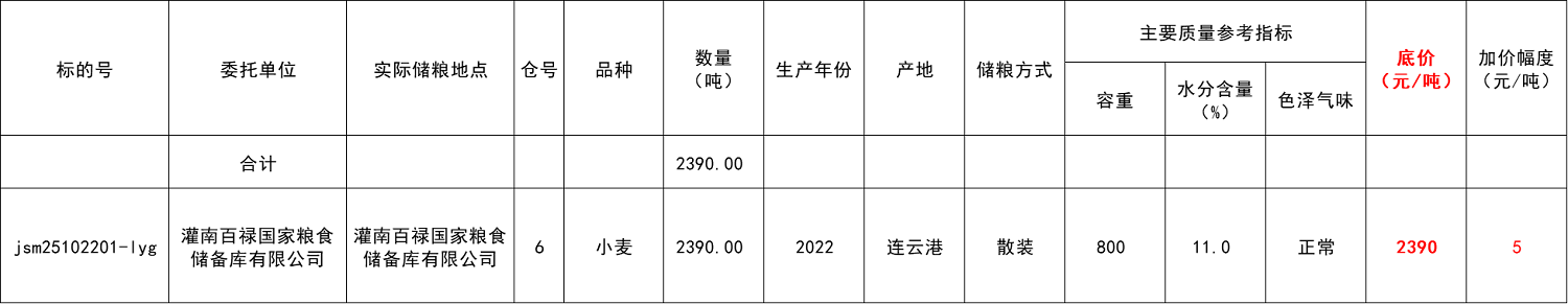 交易价格:卖方仓库车板价(散装、不含集装箱)。应价起点数量为每个标的的全部数量。销售底价2022年小麦2390元/吨,竞价阶梯5元/吨,收取中标方成交金额0.8‰的手续费。