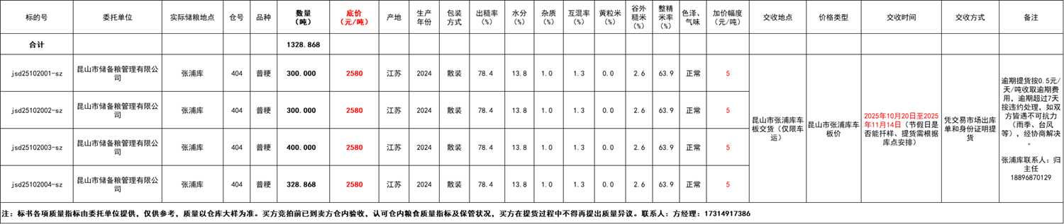 六、交割事项:成交后买受人将货款汇至江苏市场账户并在系统开具出库单,凭市场出库单和身份证明到卖方库点提货,交割完成后买卖双方凭确认单到交易市场退保证金(保证金在开出库单时不冲抵货款,待合同履约结束后统一释放)。交割期为2025年10月20日至2025年11月14日(节假日是否能扦样、提货需根据库点安排)逾期提货按0.5元/天/吨收取逾期费用,逾期超过7天按违约处理。交割逾期按照《江苏地方粮食竞价交易细则》处理,将买方预交的履约保证金和交易保证金分别划拨给卖方和江苏市场。如遇不可抗力(雨季、台风等),经双方协商解决。